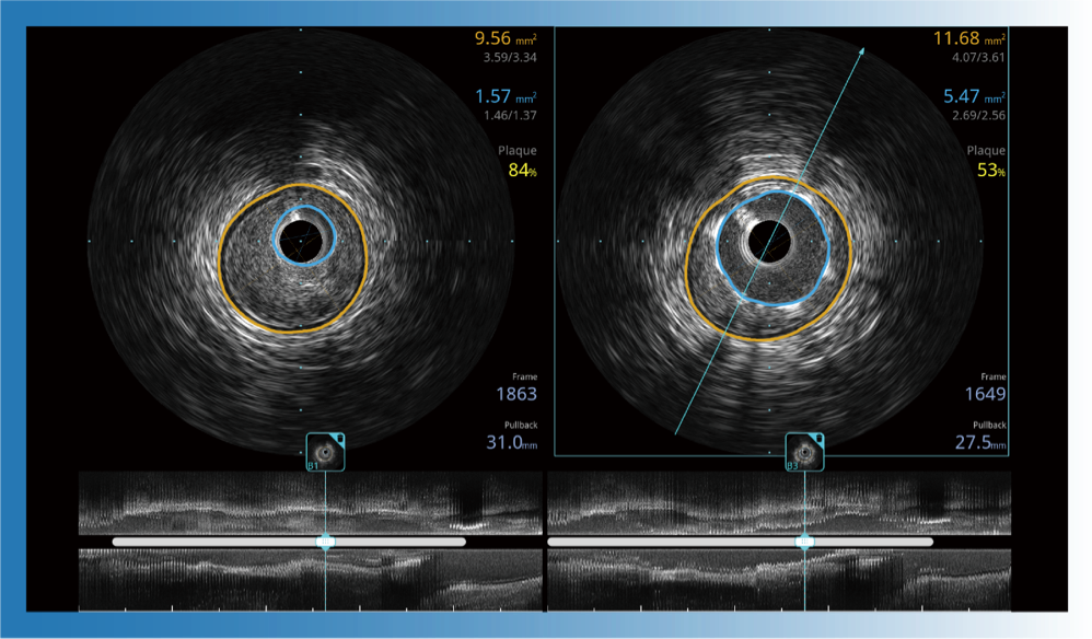 血管內(nèi)超聲(IVUS) 通過對病變程度、性質(zhì)和累及范圍的精確判斷,可幫助選擇治療策略和方法,指導(dǎo)介入治療過程,能夠降低主要不良心血管事件,改善預(yù)后,在復(fù)雜病變介入治療中用于指導(dǎo)支架置入的優(yōu)勢更為明顯。血管內(nèi)超聲(IVUS)已成為精準(zhǔn)心血管介入治療的“金標(biāo)準(zhǔn)”。