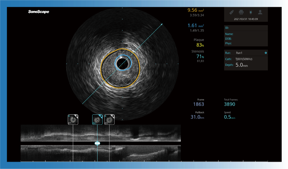 對比傳統(tǒng)IVUS導(dǎo)管成像,開立寬頻IVUS圖像的近場支架梁顯影更細(xì)膩,遠(yuǎn)場中膜外血管仍清晰可辨,兼顧遠(yuǎn)中近,兼顧分辨力與穿透深度